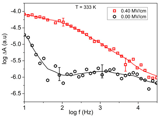 Example of the data analysis. The modulated signal (second harmonic) measured with the lock-in amplifier is displayed in dependence of the frequency of the external electric field. As spacer, a PET foil of ~3 µm thickness was used. This results for an applied voltage of +/−120 V in an electric field strength ~+/−0.4 MV/cm with a large uncertainty because the absolute sample thickness cannot be measured with sub-µm accuracy. The data are averaged, and for the resulting curve (solid lines), uncertainty bars are indicated. By division, the orientation polarization spectra are obtained as shown in Figure 7.