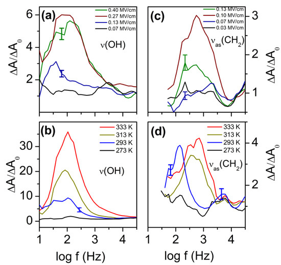 where and are the wave functions of the initial and exited states. Assuming that these are not seriously changed by the application of an external frequency dependent electric field ext (ω), it is expected that the orientation polarization of polar moieties is also reflected in the square of the transition moment, which is proportional to the respective IR absorption (Figure 3). If the change in the absorption is caused solely by orientation polarization,