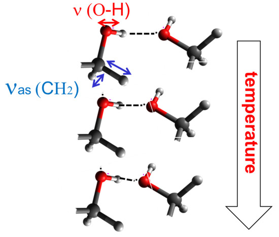 Scheme interpreting the observed specific orientation polarization for the O-H and CH2 moieties. The former has a dipole moment of 2.67 Debye; at temperatures > 283 K the O-H…O bonds are open, and the O-H dipole is subject to orientation polarization. With decreasing temperature, H-bonds are formed counteracting orientation fluctuations. The CH2 unit is nearly nonpolar, but due to the immediate neighborhood of the polar O-H moiety, it is coupled to its orientation fluctuations. With increasing H-bond, formation dies out as well.