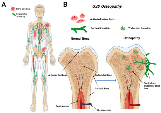 Visual representation of symptoms associated with Gorham-Stout Disease (GSD). GSD patients have regionally aggressive bone loss caused by abnormal lymphatic invasion (A). During GSD, both cortical and trabecular bone are resorbed due to lymphatic invasion (B).