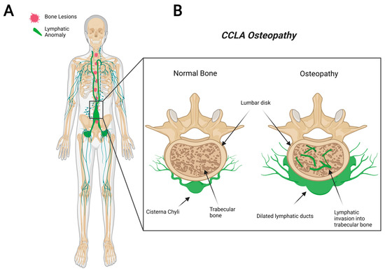 In CLAs, abnormal organization and growth of lymphatics occurs in surrounding tissues, including bone. The skeletal system provides structural support for the body in vertebrates while also serving as a mineral storage source [18]. While the periosteum (connective tissue surrounding bone) houses an extensive network of blood and lymphatic vessels, lymphatic protrusion into cortical and trabecular bone does not normally occur. There is a continuous turnover of bone that is maintained through a balance in cytokines regulating crosstalk between bone cells and balancing bone resorption and bone formation. Skeletal remodeling is the result of the tightly regulated coordination of osteoblasts (OBs) that secrete the bone matrix, osteocytes that sense mechanical stressors, and osteoclasts (OCs) that resorb the calcified bone matrix and shape the bone [19]. Disruption of this balance leads to accelerated bone resorption or decreased bone formation throughout the bone [20,21,22]. In rare cases, we can also observe non-generalized osteolysis only affecting specific bone regions, as seen in Complex Lymphatic Anomalies (CLA) [23,24].
