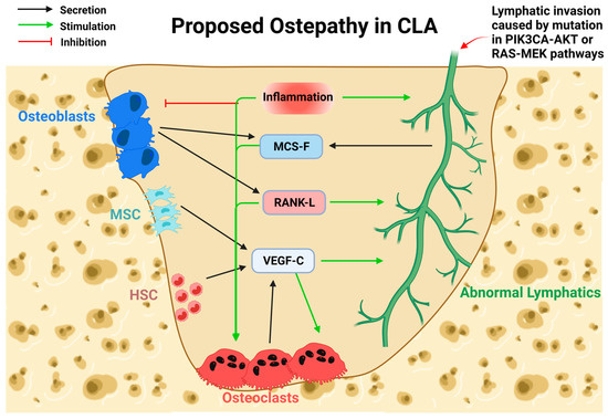 Under normal conditions, lymphatic and bone cells do not interact, but both bone and lymphatics readily secrete various cytokines and growth factors that trigger lymphangiogenesis and bone resorption (Figure 4). Since normal lymphatics can induce abnormal bone loss [89,91,98], we hypothesize that lymphatic invasion towards bone is mainly attributed to somatic mutations. After reaching the bone, direct interaction between lymphatics and bone cells will result in various forms of osteolysis, as seen in CLAs.