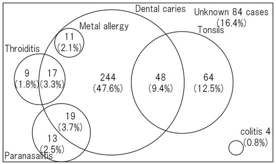 Although an association with metal allergies to dental and other metals has been reported, the percentage is as low as 5% [25], and many cases do not improve with the mere removal of dental metals [26]. Even when dental treatment is performed first and dental metal removal is performed in invalid cases, the efficacy rate is not very high at 33%, suggesting that priority should be given to dental infections first [24].