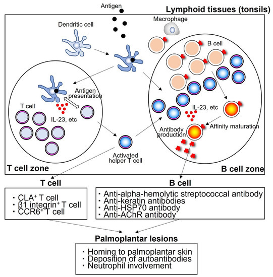 An autoimmune reaction that begins in lymphoid tissues such as the tonsils. T and B cells are activated in lymphoid tissues by cytokines such as IL-23. Activated T cells homing to the lesions on the palmoplantar surface. Activated B cells produce autoantibodies. CLA: cutaneous lymphocyte-associated antigen, CCR: C-C chemokine receptor, HSP: heat shock protein, AChR: acetylcholine receptor.