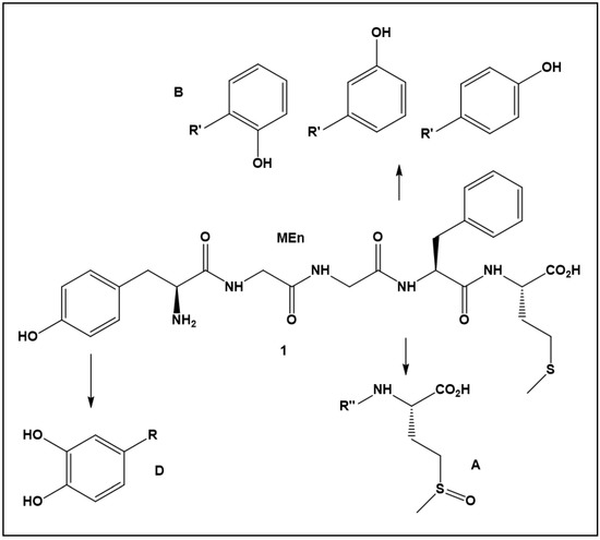 Scheme 1. MEn and some oxidative degradation products A, B and D which were generated upon near UV light exposure (25 Whm−2) of 1 mM peptide in 10 mM citrate, pH 6.0, containing 0.5–50 µM. No structure for product C is given as a structure could not be unambiguously assigned (see text). For the degradation products, only the modified side chains are shown, whereas the remainder of the peptide structures is represented by substituents R, R′, and R″.