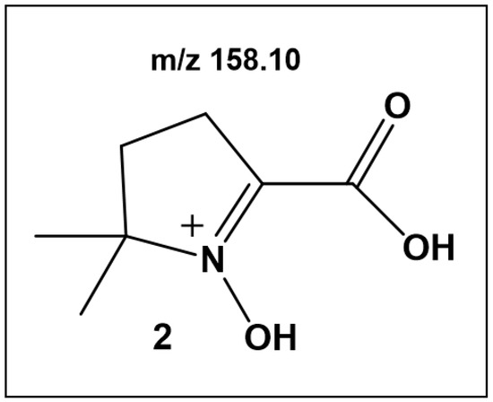 When solutions containing 10 mM oxalate or citrate, but not succinate or acetate, pH 6.0, 50 µM Fe3+, and 50 mM 5,5-dimethyl-1-pyrroline N-oxide (DMPO) were exposed to 6.8 Whm−2 near UV light, HPLC-MS analysis revealed the formation of nitrone 2 (with m/z 158.10) [23] as displayed in Scheme 2.