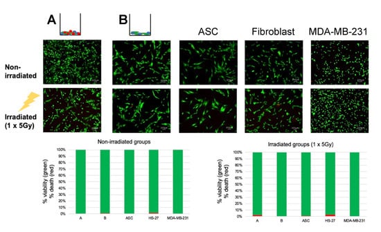 Analysis of radiation on cell viability. Top: Fluorescent micrographs of cells (group A and B) in non-irradiated and irradiated groups, separated per cell co-culture and cell monocultures. Below, proportional bar graphs showing quantified live/dead cells from irradiation. TNBC co-culture (Group A) and fibroblasts alone showed cell viability of approximately 97% in irradiated groups.