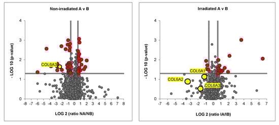 Proteomic Analysis of non–irradiated and irradiated co-cultures. Volcano plot showing significantly differently abundant proteins in irradiated TNBC matrix versus irradiated healthy matrix (red data points). Three yellow data points below the horizontal line of significance represent the three strands of collagen VI, COL6A1, COL6A2 and COL6A3.