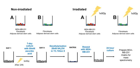 Schematic showing workflow for irradiated cell groups. Cells (group A and B) were seeded at DAY 1 and irradiated 24 h after with one dose of 5 Gy. Cells were cultured for one week, decellularized and recellularized with MDA-MB-231. One day later, samples were prepared for mass spectroscopy. Group A: MDA-MB-231, Fibroblasts, ASCs; B: Fibroblasts, ASCs.