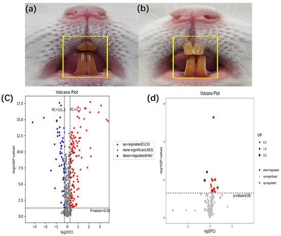 Establishment of animal model for dental fluorosis, (a) shows normal dental of mice (n = 8) and (b) shows dental fluorosis of mice (n = 6). The differentially expressed proteins and metabolites extracted from peripheral blood using the liquid chromatography tandem mass spectrometry and gas chromatography mass spectrometry, the fold change >1.2 or <0.83 and p < 0.05 were considered significant. A total of 169 differentially expressed proteins and 14 differentially expressed metabolites were obtained. The volcano of proteomics (c) and metabolomics (d) in the dental fluorosis group and control group.