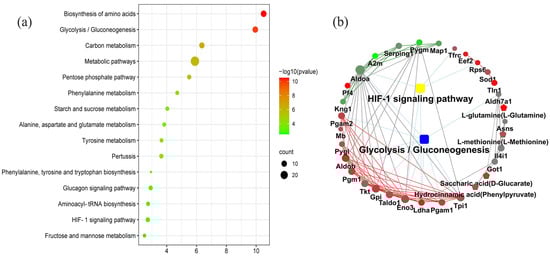 The KGML analysis showed that the HIF-1 signaling pathway contained five proteins named TFRC, RPS6, ENO3, LDHA, and ALDOA. Glycolysis/gluconeogenesis pathway covered 10 proteins named ALDH7A1, PGAM2, PGAM1, ALDOA, ALDOB, GPI, TPI1, PGM1, ENO3, and LDHA. These proteins/metabolites were mainly involved in the metabolism of sugars and energy (Figure 2b and Table 1).