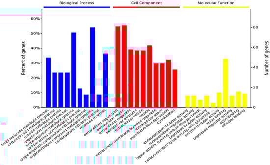 The GO enrichment analysis determined the top 10 biological processes involved in the small molecule metabolic process, organonitrogen compound metabolic process, response to stress, and single-organism developmental process. For the cell component, 53% of proteins existed in the extracellular region part. Its main molecular functions suggested that differentially expressed proteins and metabolites were related to anion binding, actin binding, carbon-nitrogen ligase activity, with glutamine as amido-N-donor, and enzyme inhibitor activity. (Figure 3).