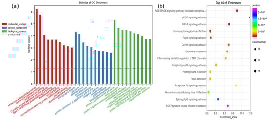 The top 10 gene ontology (a) and top 15 KEGG pathways (b) enrichment analysis of fluoride-related genes using oebiotech, and the fluoride-related genes are obtained from Gene Cards (https://www.genecards.org/; accessed on 18 April 2022) with a score greater than 1.5.