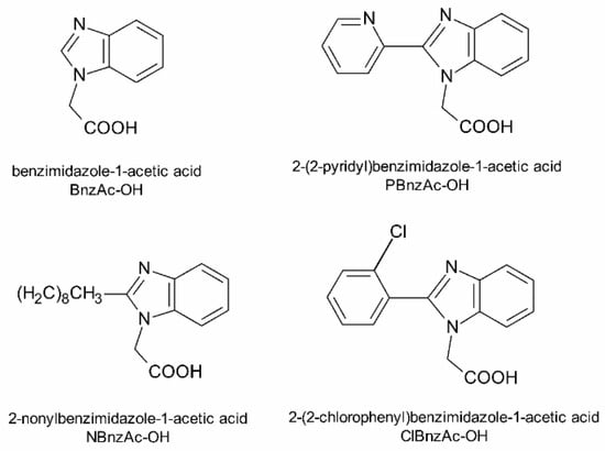 Benzimidazole derivatives (BnzAc-OH, NBnzAc-OH, PBnzAc-OH and ClBnzAc-OH) were obtained by reacting t-butyl bromoacetate (1 eq) with an appropriate substrate (1.5 eq): benzimidazole, 2-nonylbenzimidazole, 2-(2-pyridyl) benzimidazole and 2-(2-chlorophenyl) benzimidazole in the presence of K2CO3 (1.2 eq) and catalytic amounts of tetrabutylammonium iodide (TBAI). Reactions were carried out in acetonitrile (ACN) for 20 h at 60 °C. After the syntheses had been completed, t-butyl groups were removed using 50% trifluoroacetic acid (TFA) in dichloromethane (DCM) for 2 h at room temperature. Crude products were purified by column chromatography on silica gel using methanol:ethyl acetate as the eluent. Fractions of the highest purity (>98%) were analyzed by an analytical reversed-phase high-performance liquid chromatography (RP-HPLC) system (Prominence, Shimadzu, Duisburg, Germany) using a Kinetex XB-C18 column (Phenomenex, 4.6 × 150 mm, 5 µm particle size) with several gradients of ACN with 0.08% TFA at a flow rate of 1 mL/min. Identities of compounds were confirmed by MALDI-TOF mass spectrometry (Bruker BIFLEX III, Bruker Daltonics, Billerica, MA, USA) using the α-CCA (α-cyano-4-hydroxycinnamic acid) matrix. Thus, the obtained benzimidazole derivatives (Figure 1) were attached on-resin to the ε-amino group of Lys7 residue within the TP10 structure.