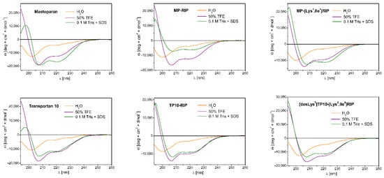 In the 50% TFE environment, we observed significant changes in the CD spectra of all peptides tested. The spectra were characterized by the presence of two negative bands (deeper at about 208 nm and shallower at about 222 nm) and a distinct positive band at about 193 nm, indicating the tendency of peptides to adopt helical structures in a membrane—mimetic environment. The lowest tendency to adopt a helical structure was demonstrated for three analogs: MP-retroMP, MP (4–14)-RIP, MP (4–14)-[Lys2, Ile4] RIP—the fH values for these peptides were in the range 0.23–0.24. On the other hand, the highest tendency to adopt the helical structure was shown by peptides such as: [Lys7 (PBnzAc)] TP10 (fH = 0.51), as well as RIP-MP, unmodified MP, [Lys2, Ile4] RIP-MP, MP-RIP, Galp, TP, TP10, and [desLys7] TP10-[Lys2, Ile4] RIP (fH = 0.34–0.38).