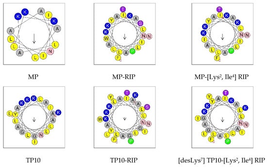 Examples of helical wheel projection for MP and its selected analogs. In this view through the helix axis, the hydrophilic residues (K, N, G, S, T) are located on one side and the hydrophobic residues (L, A, I, F, W, Y) on the other side of the helix. The arrow shows the hydrophobic moment (µH) vector. N—N-terminus; C—C-terminus. Helical wheel projections were made with HeliQuest https://heliquest.ipmc.cnrs.fr/ (accessed on 1 June 2022).