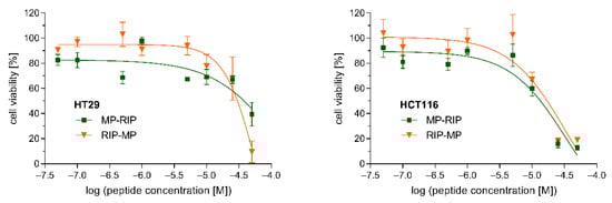 The cytotoxicity of the selected MP analogs, MP-RIP and RIP-MP, was determined against two human cell lines. The viability of HT29 and HCT116 cells incubated with various concentrations of MP-RIP and RIP-MP was assessed by the MTT assay (Figure 4). Both cell lines showed similar sensitivity to the tested peptides after 24 h of incubation. Our studies demonstrated that peptides up to a concentration of 10 µM did not substantially affect the viability of these cells (Figure 4). Moreover, based on the regression curves of cell viability, lethal doses of MP analogs sufficient to kill 50% of the peptide-treated cells (LD50) were calculated. In the case of HT29 cells, MP-RIP showed slightly lower cytotoxicity compared to the RIP-MP analogue (LD50 values of 38.0 µM and 30.2 µM, respectively). In contrast, the cytotoxicity of MP-RIP against HCT116 cells was slightly higher than that of RIP-MP (LD50 values of 13.2 µM and 17.0 µM, respectively). The viability of the HT29 cells indicates relatively low cytotoxicity of both analogs at a concentration corresponding to the MIC value against S. aureus. In the case of HCT116 cells, the above relationships were less evident.