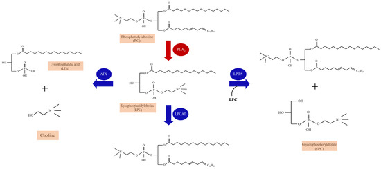 LPC, an important lipid molecule in mammalian tissues, belongs to a group of bioactive lysophospholipids [27]. Molecular species of LPC are identified by the lengths and saturation of their acyl chains. LPCs are produced from cell-membrane-derived phosphatidylcholine (PC) as a result of hydrolysis by phospholipases [28,29] (Figure 1). Two phospholipases have been studied, namely secretory PLA2 (sPLA2) and lipoprotein-associated PLA2 (Lp-PLA2) [30]. sPLA2 is Ca2+-dependent and hydrolyzes the sn-2 acyl group of the glycerophospholipids in lipoproteins and cell membranes to yield LPC and free fatty acids. In contrast to sPLA2, Lp-PLA2, also known as platelet-activating factor (PAF)-acetylhydrolase (PAF-AH) is Ca2+-independent, and it is specifically for short acyl groups at the sn-2 position of the phospholipid substrate. Lp-PLA2 can also hydrolyze oxidized phospholipids to generate LPC and oxidized fatty acids. LPC is usually present in very small concentrations because of LPC catabolism through different pathways mediated by separate enzymes: (1) after synthesized, LPC is secreted outside the cell and hydrolyzed to lysophosphatidic acid (LPA) and choline by autotaxin (ATX) [31]; (2) LPC is converted back to PCs by the enzyme lysophosphatidylcholine acyltransferase (LPCAT) in the presence of Acyl-CoA [32]; (3) LPC molecules catalyzed by cytosolic lysophospholipase-transacylase (LPTA) to form PC and glycerophosphorylcholine (GPC) [33] (Figure 1). The accumulation of LPC reflects increased PLA2-catalyzed PC hydrolysis or decreased LPC catabolism or a combination of both processes [34].