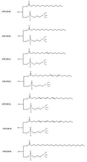 In recent years, research has begun to focus on the accurate analysis of each individual LPC species. Various LPC species have been identified by specific detection methods according to carbon chain length and number of double bonds [35], including LPC(14:0), LPC(15:0), LPC(16:0), LPC(16:1), LPC(17:0), LPC(18:0), LPC(18:1), LPC(18:2), LPC(18:3), LPC(20:0), LPC(20:2), LPC(20:3), LPC(20:4), LPC (22:6), LPC(26:0), LPC(28:1), and so on [36,37,38,39,40]. As a pro-inflammatory lipid, abnormal levels of LPC in body fluids such as blood, urine, synovial fluid, cerebrospinal fluid, and tissues are closely related to pathological states.