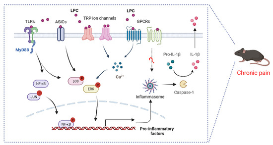TLRs are an important family of receptors involved in complex intercellular signaling networks that develop in the context of chronic pain [130,131]. TLRs can induce an innate immune response by recognizing various pathogen-associated molecular patterns (PAMPs), and the receptors that recognize these molecular structures were named as pattern recognition receptors (PRRs) [132,133]. To date, there are ten known functional TLRs (TLR1-10) in humans and twelve TLRs (TLR1-9, TLR11-13) in mice. TLR1-2, TLR4-6, and TLR10 are located on the cell surface, and TLR3, TLR7-9, and TLR11-13 are observed in intracellular compartments [134]. In addition to innate immunity, TLRs are also expressed in the periphery and in CNS cells, and are coupled with the activation of various non-neuronal cells (microglia, schwann cells and astrocytes) and neurons, thus causing the release of pro-inflammatory cytokines and thereby leading to the generation and maintenance of chronic pain [135]. TLRs play a key role in OA [136], neuropathic pain [137], chronic pelvic pain [138], opioid-induced hyperalgesia [139], and cancer pain [140]. TLR2, TLR4, TLR5, TLR3, TLR7, TLR9, etc., have been reported to contribute to persistent pain [131]. Among them, TLR2 and TLR4 have been proven to be major Toll-like receptors that to mediate LPC function. LPC activated pain markers, such as NF-κB, p38 MAPK, and JUN and cytokine production (IL-6, TNF-α) by combining the TLR2 and TLR4 receptors (Figure 4) [118]. Previous studies have reported that LPC (18:0) and LPC (18:1) were more potent than LPC (16:0) and LPC (14:0) in promoting cytokine secretion from TLR-primed cells [141].