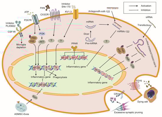 - Guo, Y.; Hong, W.; Wang, X.; Zhang, P.; Korner, H.; Tu, J.; Wei, W. MicroRNAs in Microglia: How do MicroRNAs Affect Activation, Inflammation, Polarization of Microglia and Mediate the Interaction Between Microglia and Glioma? Front. Mol. Neurosci. 2019, 12, 125. [Google Scholar] [CrossRef]