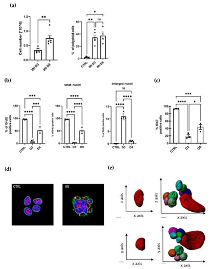 Therapy-induced senescence is associated with increased polyploidization and followed by resumption of proliferation. (a) MCF-7 breast cancer cells counted at day three (D3) and day eight (D8) after 24 h treatment with IRI (left panel); quantification of polyploid cells assessed with flow cytometry at day three (D3) and day eight (D8), >4c DNA cells were considered as polyploid (right panel); mean of at least three independent experiments ± SEM; statistical significance: * 0.01 < p < 0.05, ** 0.001 < p < 0.01. (b) Quantification of BrdU-positive MCF-7 cells; mean of at least three independent experiments ± SEM; statistical significance: * 0.01 < p < 0.05, ** 0.001 < p < 0.01, *** p < 0.001, **** p < 0.0001 (c) Quantification of Ki67-stained MCF-7 cells at day three (D3) and day eight (D8) mean of at least three independent experiments ± SEM; statistical significance: * 0.01 < p < 0.05, *** p < 0.001, **** p < 0.0001. (d) Representative images of control and treated cells stained with lamin a/c (green) and Ki67 (red), nuclei stained with Hoechst 33342 (blue). (e) 3D reconstruction of the serial block-face scanning electron microscopy (SBEM) sections. Representative reconstruction of control (on the left) and IRI-treated MCF-7 cells at D8 (on the right); scale bar = 50 µM.