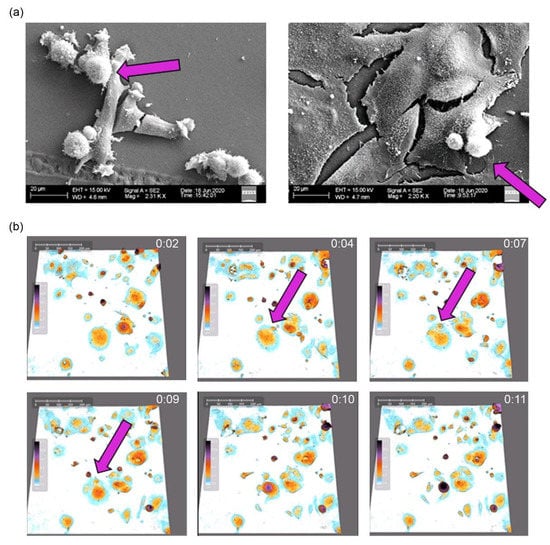 Using scanning electron microscopy, we showed that doxo-treated HCT 116 cells [] and IRI-treated MCF-7 cells are flattened and giant (Figure 2a). Some much smaller spherical cells sit on them, which can indicate that they are the offspring of giant cells. Previously, we demonstrated atypical divisions of doxorubicin-treated HCT 116 cells []. We have now documented the budding of IRI-treated MCF-7 cells (Figure 2b).