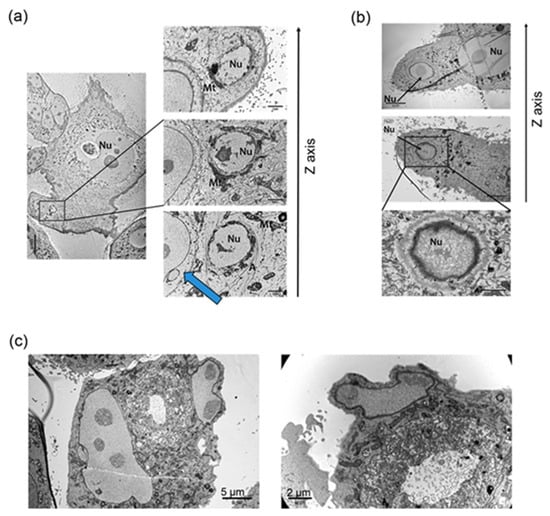 The serial block-face scanning electron microscopy (SBEM) method, which allows for three-dimensional reconstruction and in-depth observation of the nucleus structure, was applied. Scans obtained with this method were used to prepare a three-dimensional reconstruction of senescent/polyploid cell nucleus (Figure 1e, right panel), which highlights its complex and irregular structure with numerous cavities. Interestingly, the nucleus of the untreated cell also had an irregular structure; however, the presence of small subnuclei was not observed (Figure 1e, left panel).