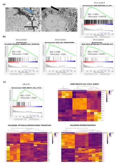 Gene set enrichment analysis (GSEA) revealed positive enrichment of gene sets related to the cellular response to lipids in D3 cells compared with control (Figure 4a), together with genes related to stemness characteristics such as epithelial to mesenchymal transition, ABC transporters and drugs metabolism (Figure 4b). Moreover, senescent/polyploid cancer cells are characterized by lipid droplet accumulation (Figure 4a, black arrow), and glycogen accumulation (Figure 4a, blue arrow) can be seen. A comparison of the transcriptome between control–D3–D8 revealed the altered expression of genes related to the meiotic cell cycle, spermatogenesis and EMT in D3 and D8 cells (Figure 4c). We discovered a few genes expressed only in D8 cells that were related to the meiotic cell cycle: MYBL1, C19orf57, DUSP13, REC8 and BCL2L11. The D8 cell population comes back to some extent to the proliferative state, as shown by the mitotic cell cycle and E2F targets (Figure S2); however, it goes together with the altered expression of genes related to meiosis, spermatogenesis and EMT (Figure 4c).