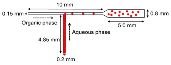For instance, Sasaki and Sugenami [44] have utilized a T-shaped microfluidic channel to form monodisperse microdroplets. The device was fabricated with the aid of a consumer-grade laser cutter with the design indicated in Figure 1. In the proposed device, the aqueous phase is pumped from the bottom of the T-shape microchannel, while the organic phase is pumped from the left side, leading to the generation of water-in-oil type microdroplets. The authors concluded that this method could be employed for creating microdroplets with high concentrations of macromolecules as in cells.