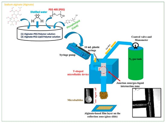 Alternatively, Mutlu et al. [45] used a T-shaped microfluidic junction device (Figure 2) to create highly monodisperse porous alginate films from the bubble bursting. Their microfluidic platform was made of polymethyl methacrylate through CNC machining. It consisted of the inlet (15 cm) and outlet (5 cm) Teflon capillaries with an inner diameter of 200 μm. Additionally, the experimental setup included a gas cylinder to provide nitrogen to the vertical capillary for producing monodisperse bubbles and a disposable plastic syringe connected to a syringe pump to ensure polymeric solution flow to the horizontal capillary.