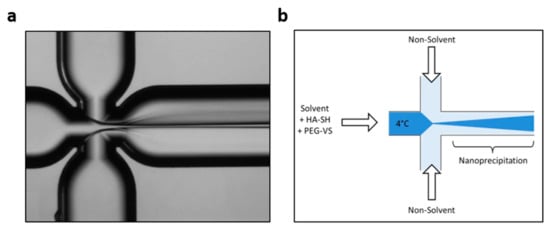 For instance, Tammaro et al. [52] have used an X-junction flow-focusing microreactor to crosslink hyaluronic acid (HA) and polyethylene glycol (PEG) (Figure 5). For this purpose, the researchers injected an aqueous solution of thiolated HA and PEG-vinyl sulfone in the middle channel and a non-solvent (i.e., pure acetone) in the side channels. For this synthesis, a quartz microfluidic platform called “Droplet—Junction Chip” was used, having channels of 190 μm depth and 390 μm width and an internal surface coated by a hydrophobic material. Even though this device has two separate droplet junctions, for the nanoprecipitation reaction, only one was employed.