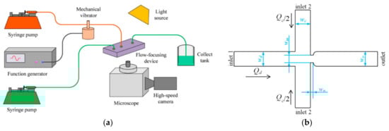 (a) Schematic diagram of experimental setup for droplet generation in flow-focusing microfluidic chip with external mechanical vibration. (b) Schematic diagram of the flow-focusing microfluidic chip. Reprinted from an open-access source [53].