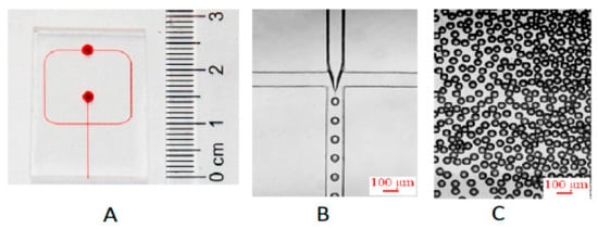 (A) Photograph of the polydimethylsiloxane (PDMS) microchip. Channel and reservoirs were full of red ink for visualization. (B) Micro photo of the process of microdroplets preparation at cross-junction channel. The velocity of the aqueous phase and oil phase was 14 and 80 μL/min, respectively. (C) Microphoto of microdroplets off-chip. Reprinted from an open-access source [54].