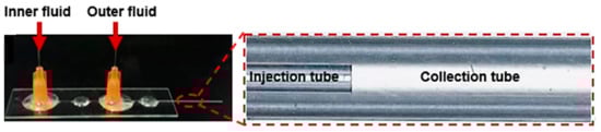 Another co-flow microfluidic device is described by Xia et al. [58]. The authors used two cylindrical glass capillaries as injection and collection tubes. The injection tube had an inner diameter of 300 μm and was coaxially positioned inside the collection tube that had a 900 μm inner diameter. Two glass tubes were further fixed on the glass sheet with the aid of epoxy glue, and their entrance was connected with a dispensing needle, as displayed in Figure 9.