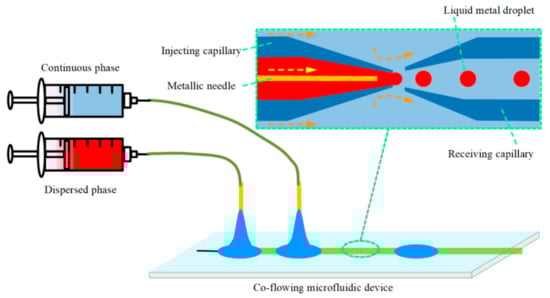- Hu, Q.; Jiang, T.; Jiang, H. Numerical Simulation and Experimental Validation of Liquid Metal Droplet Formation in a Co-Flowing Capillary Microfluidic Device. Micromachines 2020, 11, 169. [Google Scholar] [CrossRef] [Green Version]