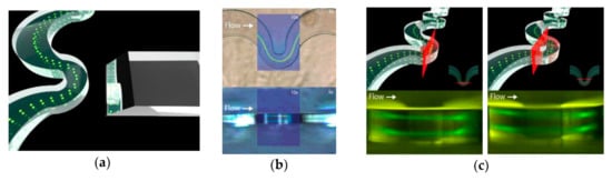 On a different note, Pedrol and colleagues [63] have studied the dynamics of spherical particles in an asymmetric serpentine (Figure 12). The authors constructed a PDMS microfluidic device with the aid of conventional photolithography techniques. In addition to the conventional channels, the designed platform also incorporated cavities for the insertion of micromachined glass mirrors oriented at 45° near the serpentine so that their fields of view covered the entire height of the channel. In this manner, the scientists were able to visualize the two stable trajectories of inertially focused fluorescent polystyrene particles.
