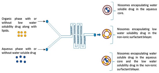 Schematic representing the microfluidic chip structure is having a staggered herringbone micromixer and the whole process of niosome formation. Reprinted from an open-access source [66].