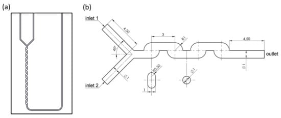 (a) Schematic representation of the microfluidic platform and (b) geometrical model of the chicane micromixer designed by Khaydarov et al. Reprinted from an open-access source [67].