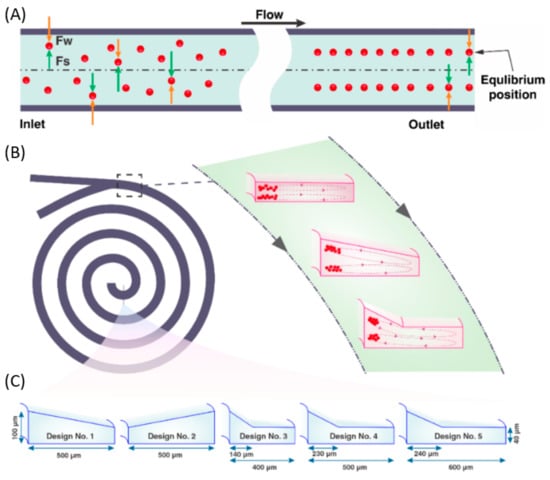 (A) The schematic illustration of particle focusing in straight rectangular microchannels. (B) Schematic of spiral microchannels. (C) Schematic of a cross-sectional view of the channels used in the work of Mihandoust et al. Reprinted from an open-access source [71].