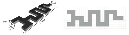 Geometry of the micromixer investigated by Jeßberger et al. (Left) Below in the picture are the two inlets Γl, Γr and the T-junction. On the top, we find the outlet Γout. (Right) Dimensions of the channel in the xy-plane on a grid with width 1 mm. Reprinted from an open access source [75].