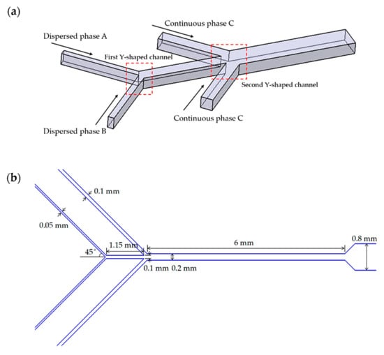(a) Configuration of the three layers comprising the microfluidic device and (b) Configuration of the cross-junction channel within the middle layer of the device utilized by Chircov et al. Reprinted from an open-access source [50].