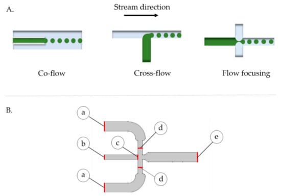 In terms of geometry, droplets or segments can be formed by passive methods within microdevices based on three main microfluidic configurations, namely coaxial flows (co-flowing systems), flow-focusing reactors, and intersecting flows in a T-shape device (T-injector) [5,26]. In addition to device geometry, the channels’ dimensions and fluids’ flow rates need to be regulated to ensure precise monitoring and control over nanoparticle production through droplet microfluidics [33,35].