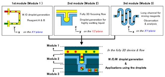 - Morimoto, Y.; Kiyosawa, M.; Takeuchi, S. Three-dimensional printed microfluidic modules for design changeable coaxial microfluidic devices. Sens. Actuators B Chem. 2018, 274, 491–500. [Google Scholar] [CrossRef]