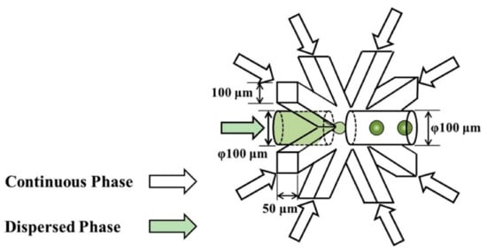 As opposed to flow-focusing devices, in co-flowing microreactors, the dispersed and continuous phases are delivered from the same direction. In more detail, the dispersed phase is injected into a small capillary centered inside a larger-diameter channel filled with the continuous phase flowing in parallel. Thus, the continuous phase surrounds the dispersed phase, making the viscous shear force stronger with the increase in dispersed phase diameter and leading to its fracturing into monodispersed droplets or a liquid jet. The regimens differ depending on flow rates, as follows: at low flow rates, dripping is predominant, producing spherical droplets; at high flow rates, jetting is predominant, leading to droplets formation via the breaking of a thin stream of dispersed phase farther downstream due to convective instabilities [1,26,46].