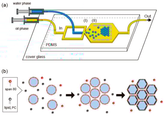 - Fujiwara, S.; Shoji, K.; Watanabe, C.; Kawano, R.; Yanagisawa, M. Microfluidic Formation of Honeycomb-Patterned Droplets Bounded by Interface Bilayers via Bimodal Molecular Adsorption. Micromachines 2020, 11, 701. [Google Scholar] [CrossRef] [PubMed]