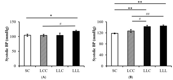 Blood pressure of offspring. (A) At 8 weeks old (N = 8 in each group). (B) At 16 weeks old. Four groups were evaluated by one-way ANOVA with the LSD post hoc test. * vs. SC, p < 0.05; ** vs. SC, p < 0.01; # vs. LCC, p < 0.05; ## vs. LCC, p < 0.01.