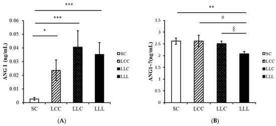 Offspring renal cortex ANG I (A) and ANG 1-7 (B) levels. Four groups were evaluated by one-way ANOVA with the LSD post hoc test. * vs. SC, p < 0.05; ** vs. SC, p < 0.01; *** vs. SC, p < 0.001; # vs. LCC, p < 0.05; § vs. LLC, p < 0.05.