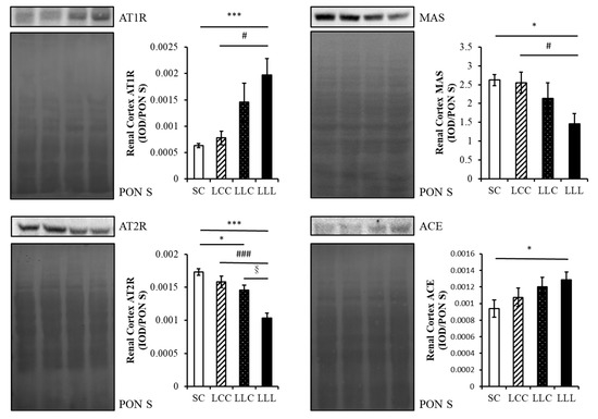 Offspring renal cortex AT1R, AT2R, MAS, and ACE abundance. Four groups were evaluated by one-way ANOVA with the LSD post hoc test. * vs. SC, p < 0.05; *** vs. SC, p < 0.001; # vs. LCC, p < 0.05; ### vs. LCC, p < 0.001; § vs. LLC, p < 0.05.