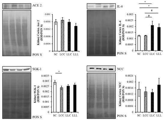 Offspring renal cortex ACE2, IL-6, SGK1, and NCC abundance. Four groups were evaluated by one-way ANOVA with the LSD post hoc test. * vs. SC, p < 0.05; # vs. LCC, p < 0.05.